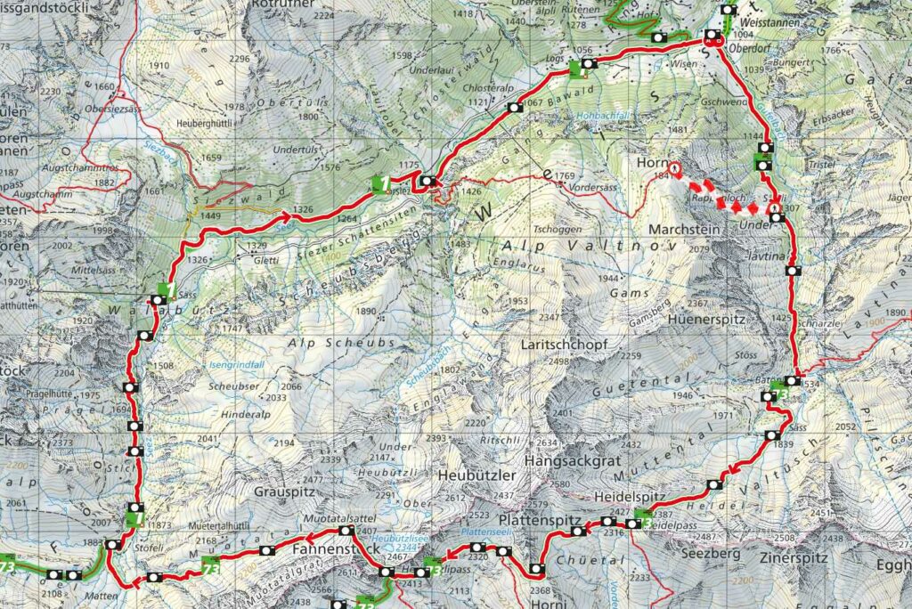 The route goes over the more classic route from Weisstannen to Batöni waterfalls (section 1), crosses the Indiana-Jones-Bridge, and climbs up towards Heidelpass (section 2), where there is a left-fork to St. Martin im Calfeisental. My route goes to the right towards Sardonahütte SAC (section 3). From the Sardonahütte fork, the route goes up Heubützlipass and on to Muotatalsattel (not to be confused with Muotatal, SZ) (section 4). From there, the route goes through the valley to Foospass-fork (section 5), and then all the way down towards Walabütz (section 6). From Walabütz to Weisstannen, there is an asphalt road and a parallel trail as well (section 7).